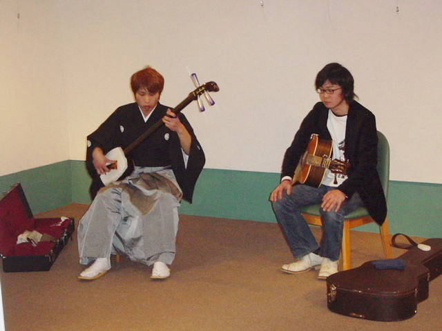 そして今日の本命の大島さんの登場・・・演奏には熱が入っていて、素晴らしいと思う場面で拍手や手拍子が飛び出しました。特に 「飛鳥」という曲は、なかなかのもの。 津軽三味線を初めて聞く人も多く、いろんな質問が出てました。三味線は何で出来てるか、プロの三味線はいくらだろうかなど興味津々で演奏同様聞き耳をたてておられました。 ネットの面々と地域にお住まいのみな様意気投合。終わってほしくないとアンコールが2回・・奏者も聴衆も疲れかけたところでコンサートは終了。終了後は質問攻めの2人、さぞたいへんだったことでしょう。 大島さんはじめ参加の皆様おつかれさまでした。 |